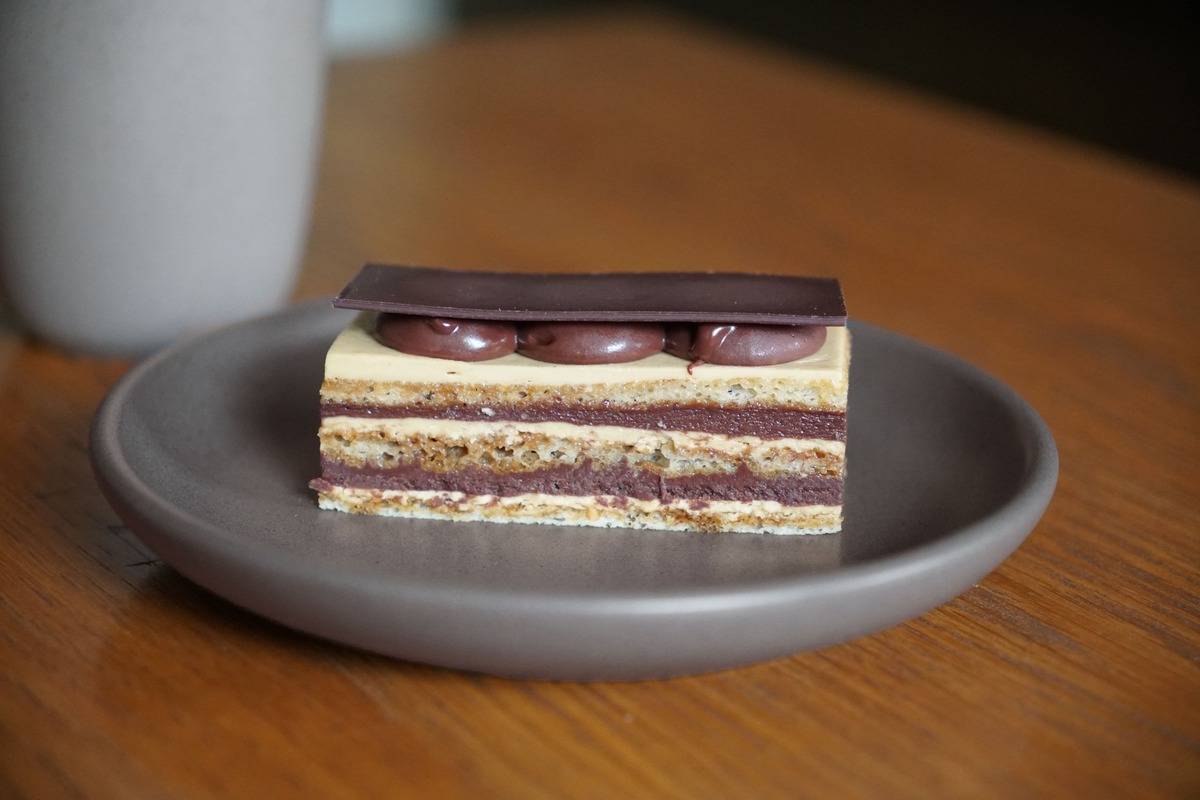 一番上の薄いチョコレートがパキッと割れ、なめらかなガナッシュとしっとりとした層が現れる、フォークを入れた瞬間からワクワクするオペラ。口に入れると、ガナッシュが自家焙煎コーヒーのフレーバーを優しく引き出し、余韻までコーヒーの果実味が残ります。