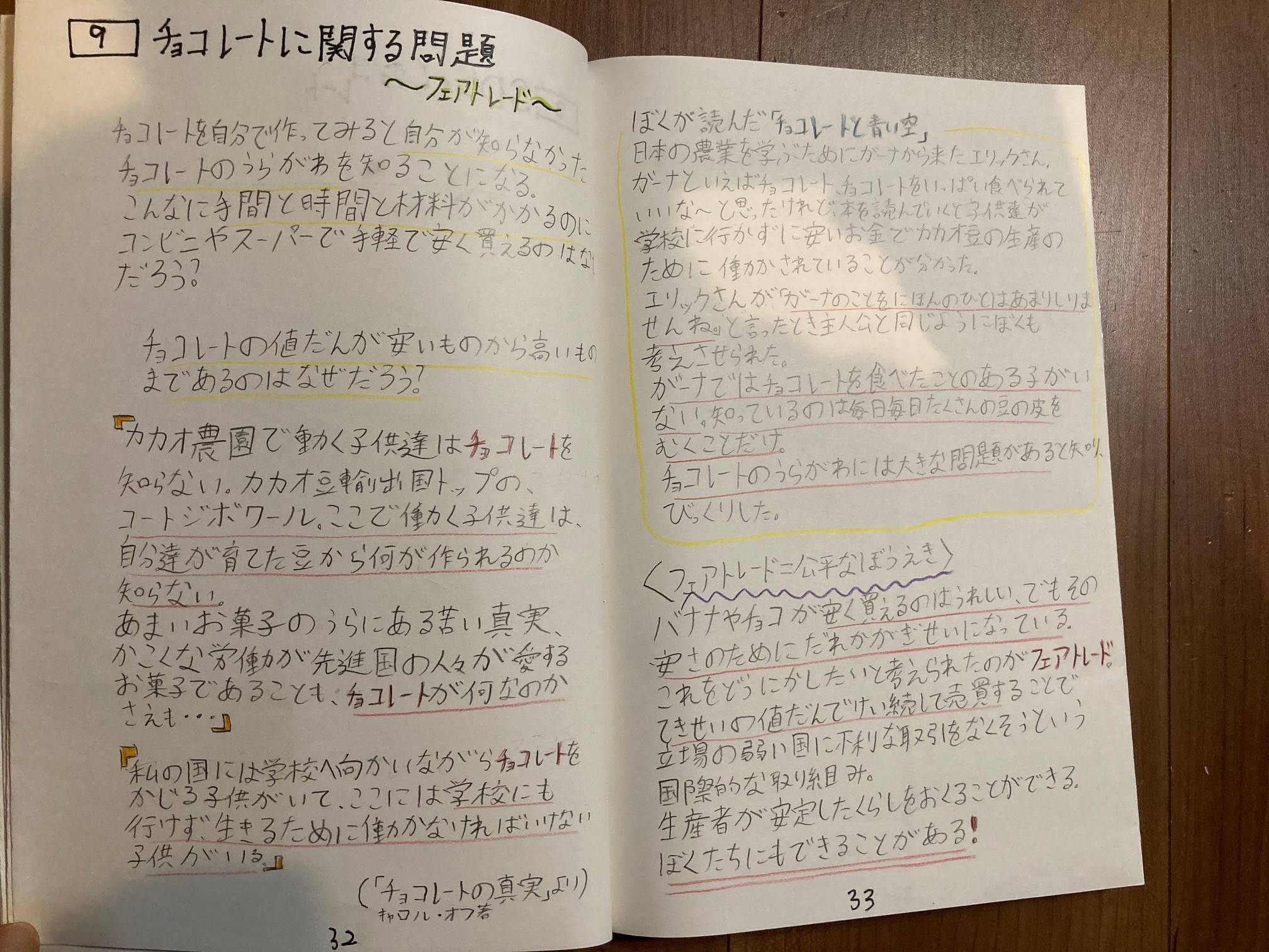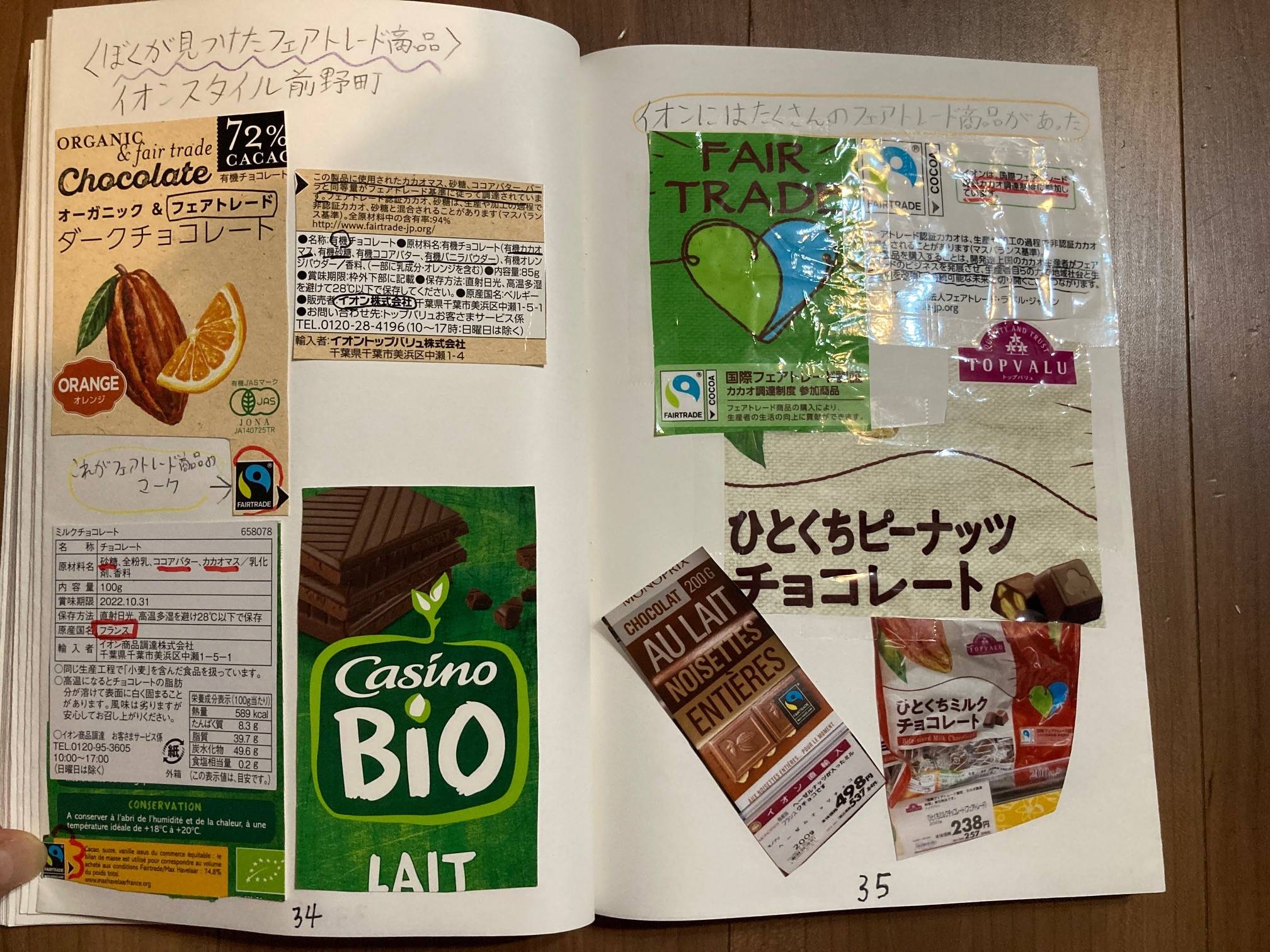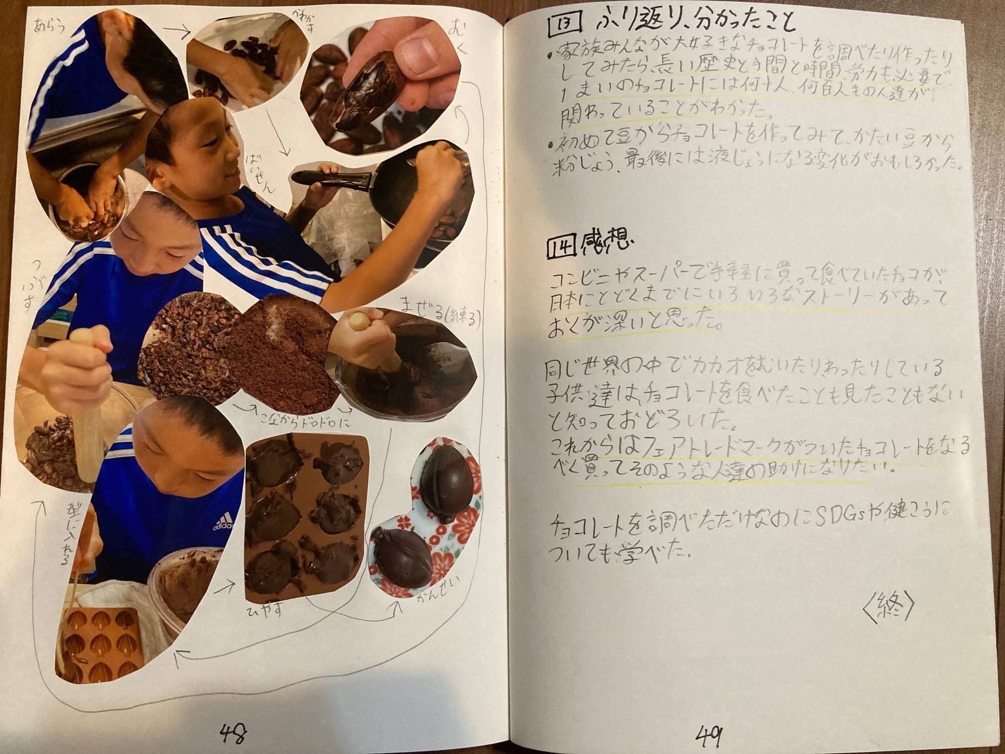 なんと、約50ページの超大作!ワークショップの体験だけでなく、自宅でカカオ豆からチョコレートを作ってみたり、フェアトレードについても調べたりしたそうです。