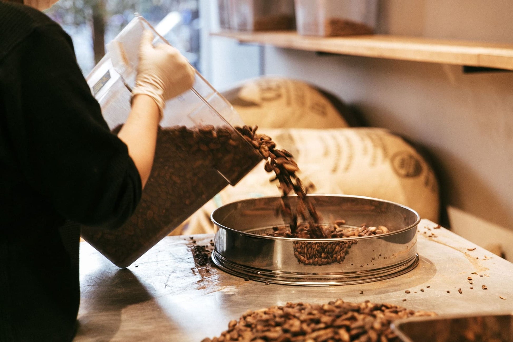 焙煎が終わったら、カカオ豆を細かく砕き、外側の皮と内側のカカオニブを分離します。カカオ豆の風味はカオニブの中に閉じ込められています。その豊かな香りを引き出すために、ウィノウワーで割れた豆に送風し、軽くて毛羽立った状態の皮を吹き飛ばします。砕いたカカオ豆の粒は一つ一つ異なるため、振動スクリーンを用いて大きさごとに選別し皮を取り除いていきます。このプロセスを何度か繰り返します。