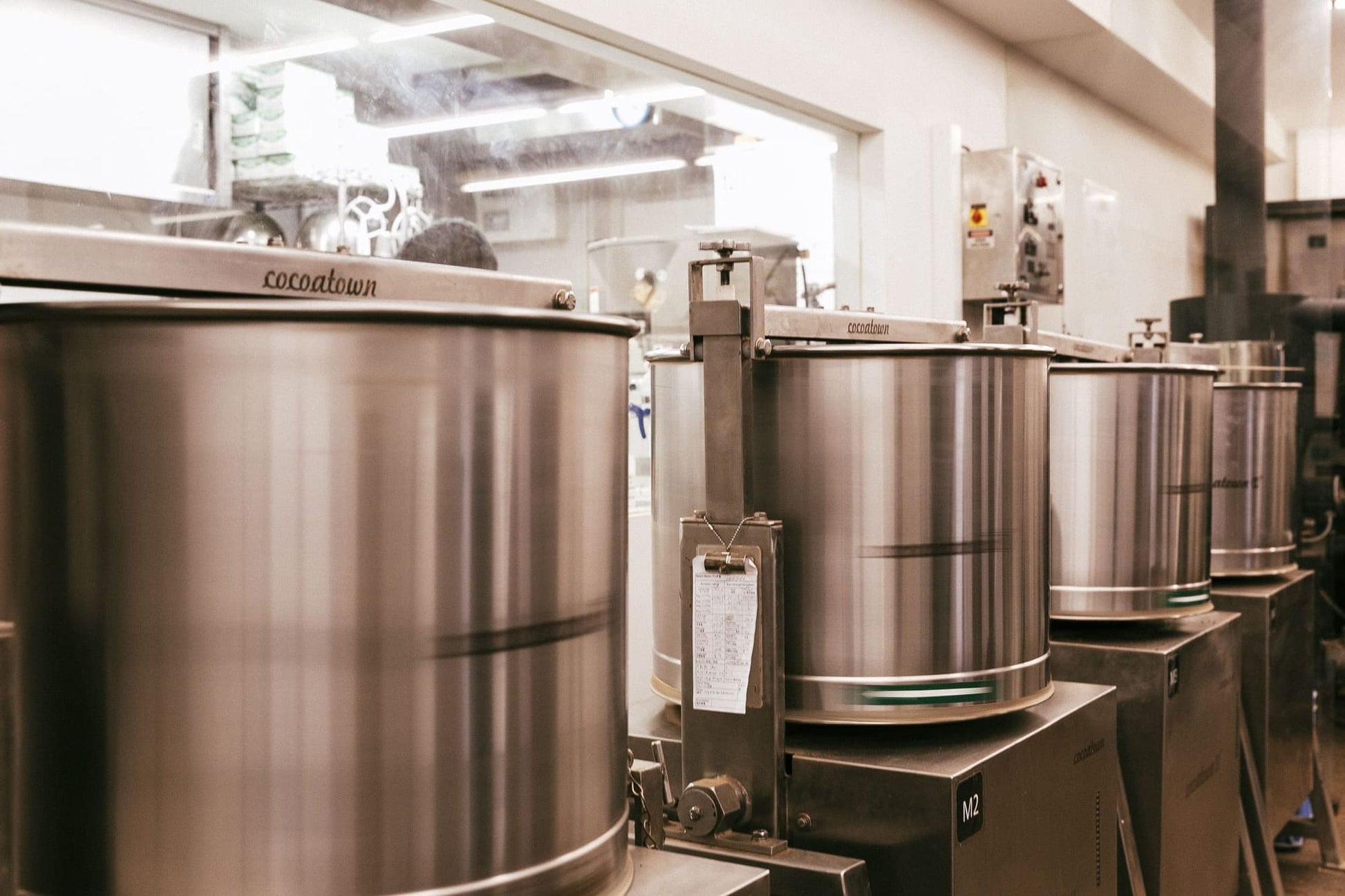 次にメランジャーと呼ばれるドラムシリンダーで、カカオニブとオーガニックのきび糖を合わせて挽いていきます。ダンデライオンの製法では、約三日間かけて、粒の大きさを20〜29ミクロンまで小さくします。この工程で砂糖とカカオニブが均一に混ざり、カカオに含まれている脂肪分の働きにより、舌の上でシルクのような滑らかさを感じることができるチョコレートが生まれます。