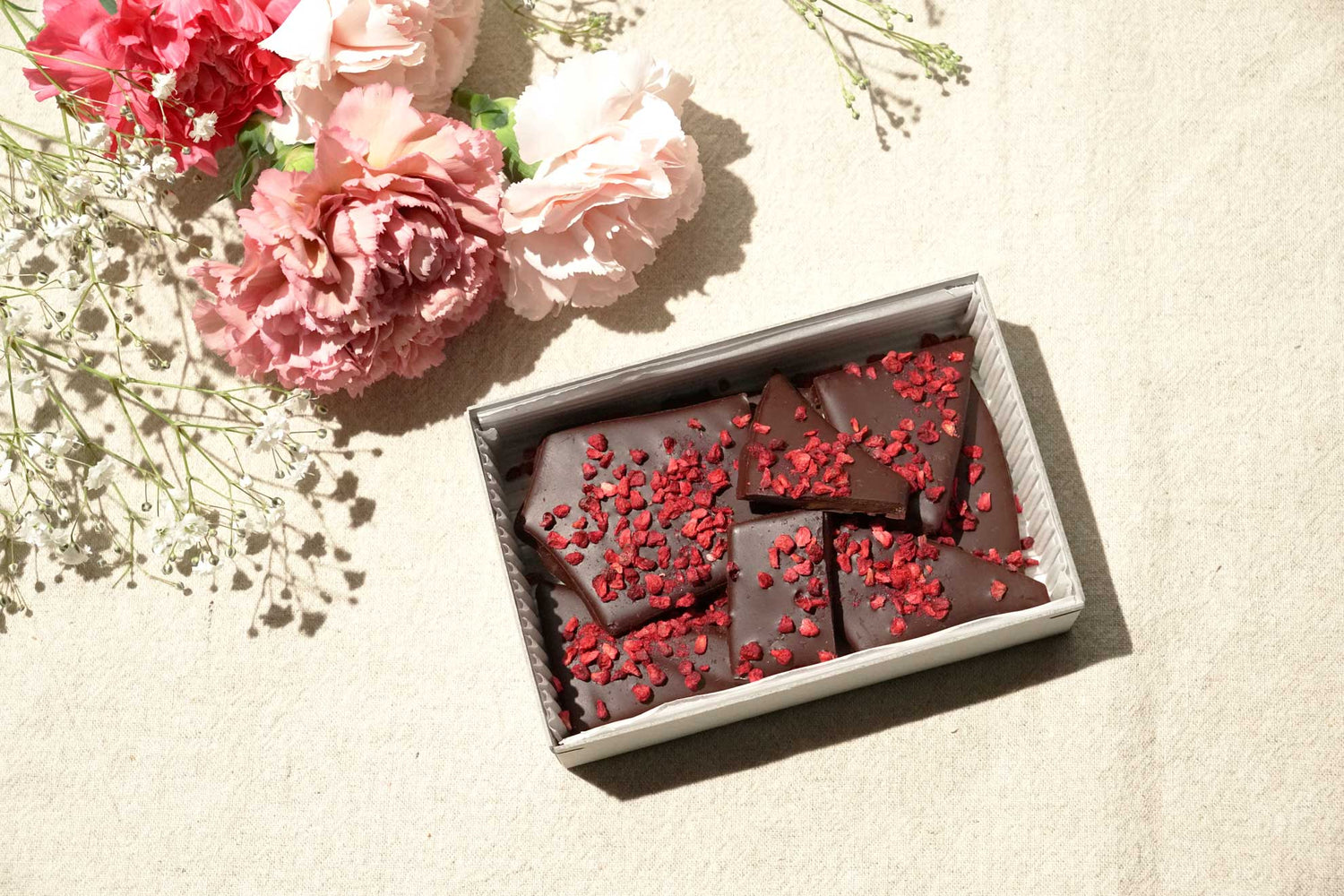 無添加・無着色のドライラズベリーをたっぷりトッピングした、見た目にも華やかな「ラズベリートフィーチョコレート」。