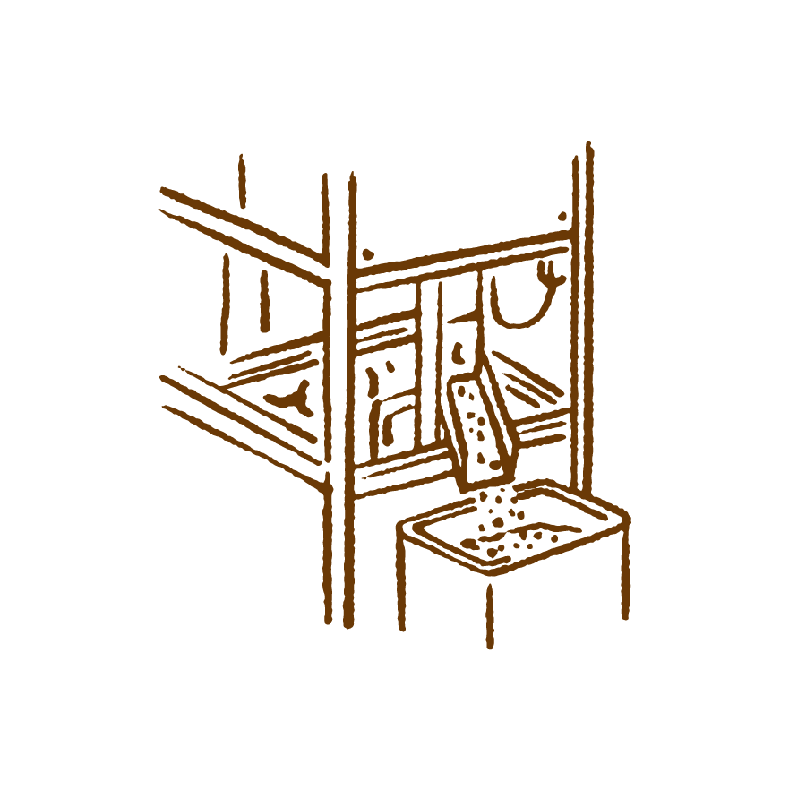 焙煎が終わったら、カカオ豆を細かく砕き、外側の皮と内側のカカオニブを分離します。カカオ豆の風味はカオニブの中に閉じ込められています。その豊かな香りを引き出すために、ウィノウワーで割れた豆に送風し、軽くて毛羽立った状態の皮を吹き飛ばします。砕いたカカオ豆の粒は一つ一つ異なるため、振動スクリーンを用いて大きさごとに選別し皮を取り除いていきます。このプロセスを何度か繰り返します。