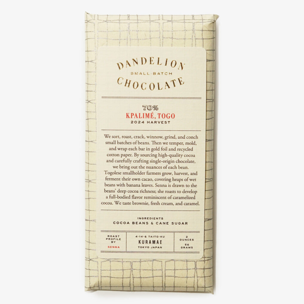 西アフリカ・トーゴ産カカオ豆を使用。カカオの魅力的な果実味を損なうことなく、酸味をやわらげ、ミルキーで食べやすい味わいに仕上げています。